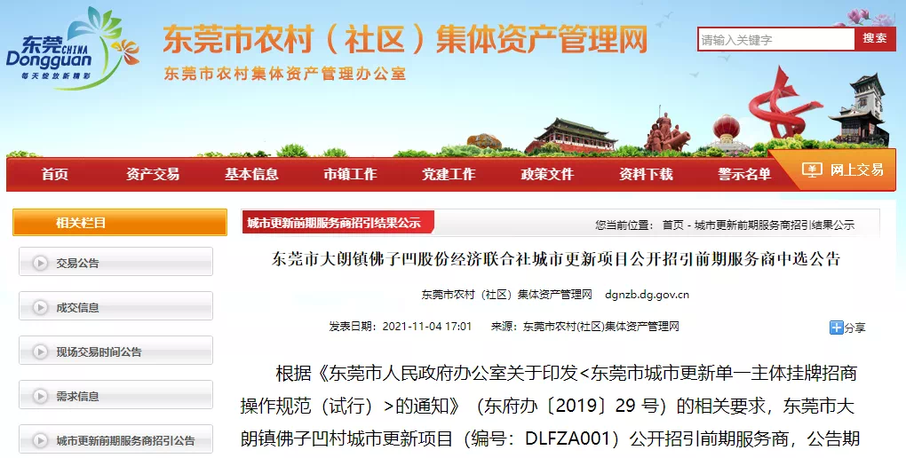 近日,东莞市农村(社区)集体资产管理网发布“东莞市大朗镇佛子凹股份经济联合社城市更新项目公开招引前期服务商中选公告”。据该“公告”,确认“东莞市睿奥城市更新服务有限公司”为东莞市大朗镇佛子凹村城市更新项目(编号:DLFZA001)的前期服务商。