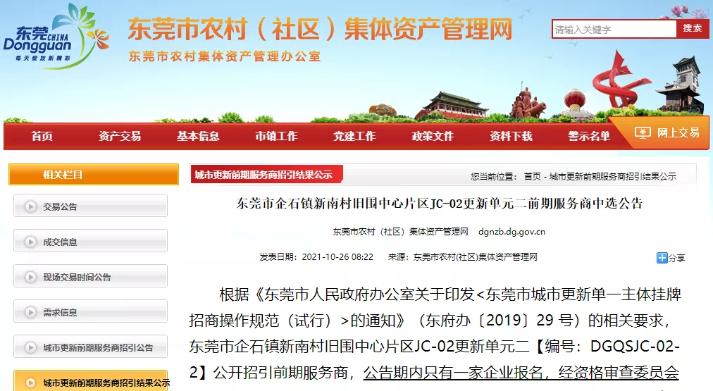 近日,东莞市农村(社区)集体资产管理网发布“东莞市企石镇新南村旧围中心片区JC-02更新单元二前期服务商中选公告”。据该“公告”,确认东莞市勤诚达商业管理有限公司成为该项目的前期服务商。