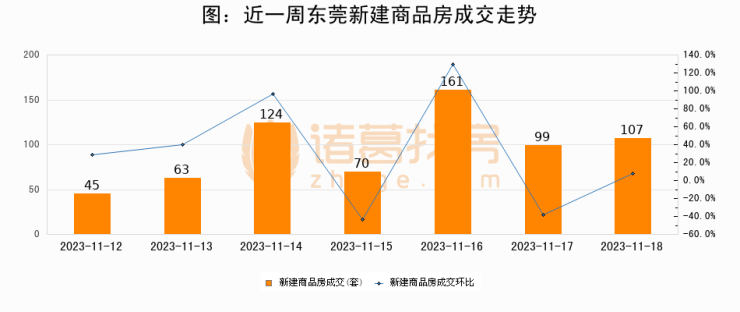 根据东莞市住房和城乡建设局数据显示,2023年11月18日东莞新建商品房成交107套,较昨日增加8套,环比上涨8.1%