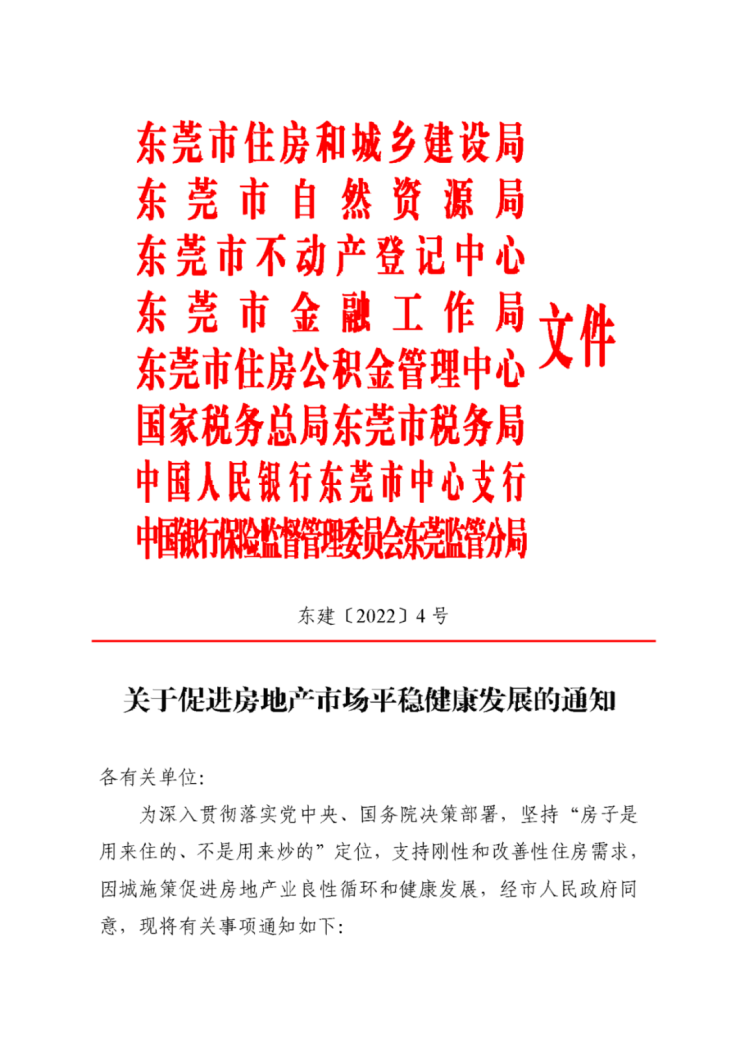 5月14日,东莞市住房和城乡建设局、东莞市自然资源局、东莞市不动产登记中心、东莞市金融工作局、东莞市住房公积金管理中心、国家税务总局东莞市税务局、中国人民银行东莞市中心支行、中国银行保险监督管理委员会、东莞监管分局九部门联合发布《关于促进房地产市场平稳健康发展的通知》(东建〔2022〕4号)(以下简称《通知》)。