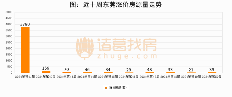 从调价房源来看,第50周东莞涨价房源39套,较上周上涨85.7%。与此同时,50周涨价房源占比提升5.32个百分点,业主信心持续恢复。