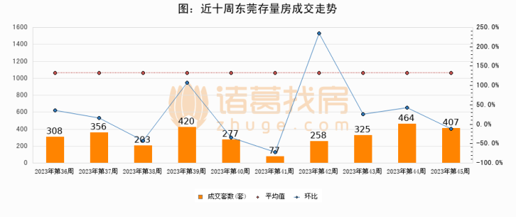 存量房方面,第45周东莞存量房成交407套,较上周减少57套,环比下降12.3%。从近十周成交走势来看,周均成交套数为309套,本周高于平均水平31.7%。