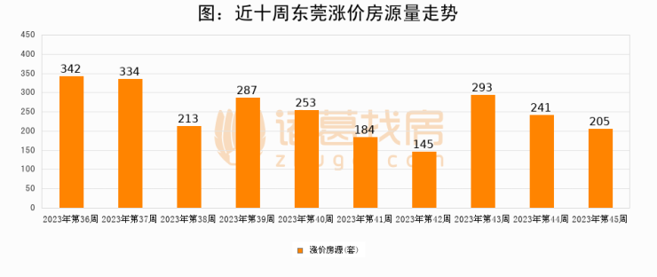 从调价房源来看,第45周东莞涨价房源205套,较上周下降14.9%。与此同时,45周涨价房源占比回落0.89个百分点,业主信心小幅波动,购房者可则需入市。