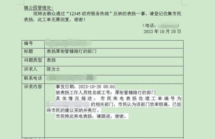 “我妈再去公园的时候发现天没亮,但是公园的路灯已经亮着了,几个阿姨还觉得奇怪,告诉她们是向12345热线反映了,所以照明设施开关时间调整了,大家都很开心。”陈女士对于相关部门快速响应、积极调整亮灯时间的举措赞不绝口,并通过12345热线表扬厚街镇相关部门重视群众诉求、工作高效。