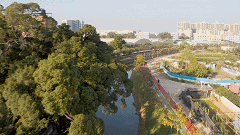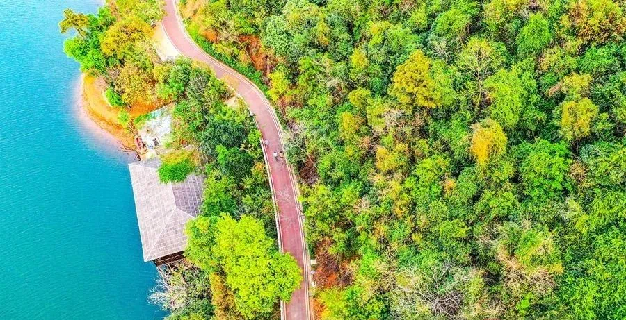 莲花湖绿道依山傍水,红、绿、黄等多彩颜色互相衬托,自然风景美不胜收,让人流连忘返。莲花湖绿道围绕莲花湖修筑而成,长度为3.5公里,临水区修筑亲水平台,沿线设水榭、景观亭、七拱桥等景观设施。通过无人机航拍图片可以看到,城在景中,景在城中,自然生态已经成为长安一张靓丽的城市新名片。