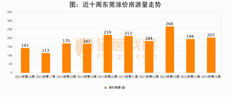 从调价房源来看,第25周东莞涨价房源203套,较上周上涨4.6%。与此同时,25周涨价房源占比回落0.18个百分点,业主信心小幅波动,购房者可则需入市。