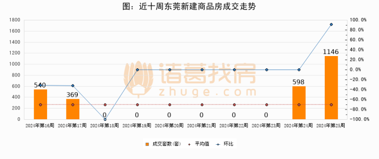 进入2024年第25周(06月17日-06月23日),东莞新建商品房成交1146套,较上周增加548套,环比上涨91.6%