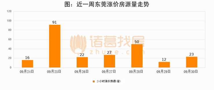 根据诸葛找房数据显示,东莞24小时涨价房源量为23套,较09月29日增加11套,环比上涨91.7%。与此同时,涨价房源占比小幅扩大,业主信心有所提升。