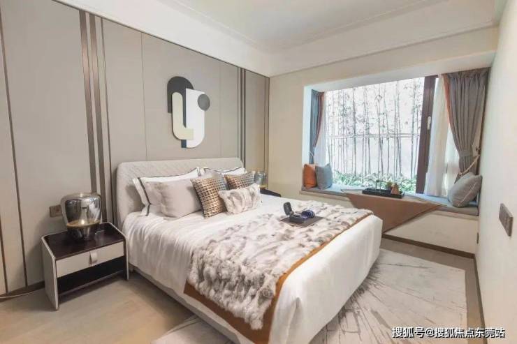 与生活阳台相连的厨房,为L型设计,“取-洗-切-煮”动线简洁流畅,且预留双开门冰箱位,大容量冰箱可囤满不同家庭成员喜好的美味;南北双阳台+全飘窗设计,为业主带来视野和采光的优化升级。特别是主卧270°转角飘窗,在家里便可欣赏到别人看不到的窗景;再加上,主卧是套间设计,带独立卫浴,可打造独立衣橱空间,日常起居实用性也有了。
