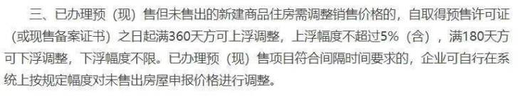 南都记者从通知了解到,已办理预(现)售但未售出的新建商品住房需变更销售价格的,自取得预售许可证(或现售备案证书)之日起或自上一次调整申报价格之日起满 30天方可变更,其他事项不变。