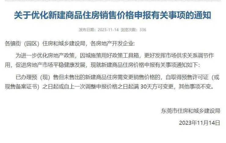 11月14日,东莞市住房和城乡建设局官网发布《关于优化新建商品住房销售价格申报有关事项的通知》(下称“通知”)。