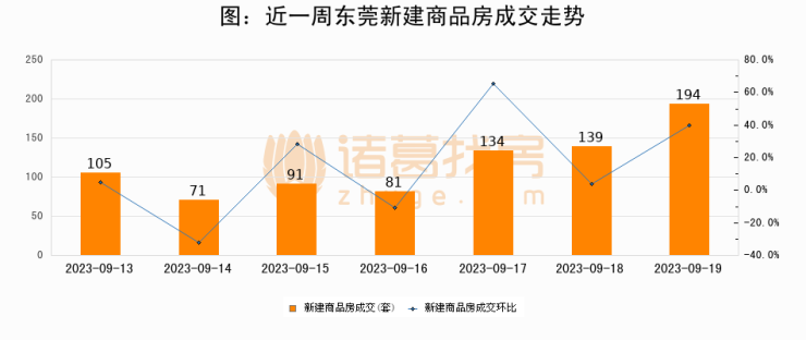根据东莞市住房和城乡建设局数据显示,2023年09月19日东莞新建商品房成交194套,较昨日增加55套,环比上涨39.6%。近一周东莞新建商品房日均成交117套。09月19日单日成交194套,高于近一周平均水平65.8%。