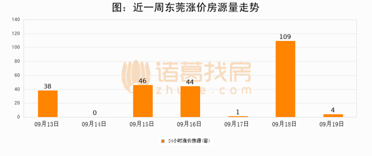 根据诸葛找房数据显示,东莞24小时涨价房源量为4套,较09月18日减少105套,环比下降96.3%。与此同时,涨价房源占比小幅回落,对于购房者来说是一个入市窗口期,购房者可抓住时机入市。