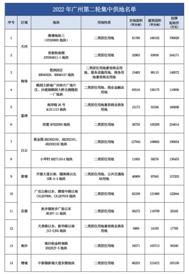 (2022年广州第二轮集中供地名单,广州市房协供图,央广网发)