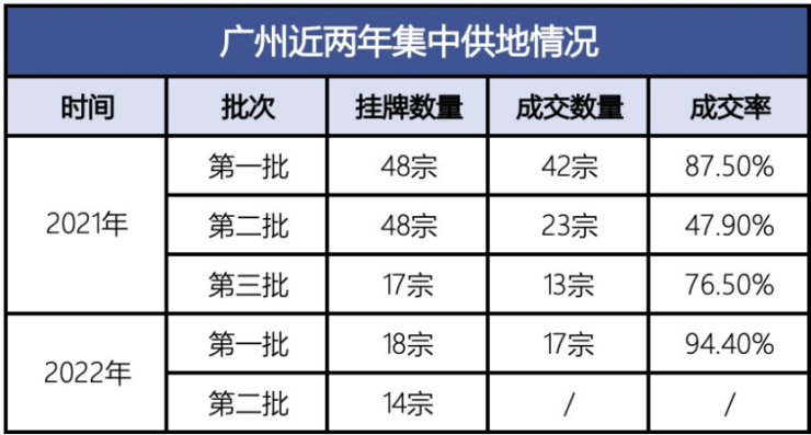 挂牌数量减少,并不代表土拍“遇冷”,而是集中供地逐步完善的体现。从上图可以看到,去年的第一、二轮土拍中,广州均一次性“上架”48宗地块,但成交率从87.5%速降至47.9%。