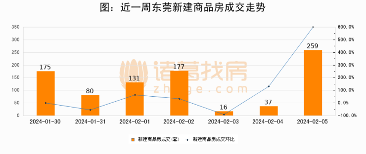 根据东莞市住房和城乡建设局数据显示,2024年02月05日东莞新建商品房成交259套,较昨日增加222套,环比上涨600%