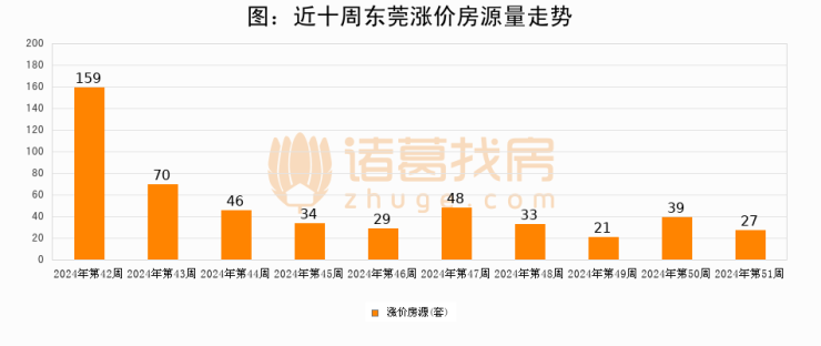 从调价房源来看,第51周东莞涨价房源27套,较上周下降30.8%。与此同时,51周涨价房源占比回落3.84个百分点,业主信心小幅波动,购房者可则需入市。