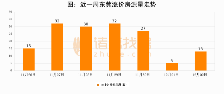 根据诸葛找房数据显示,东莞24小时涨价房源量为13套,较12月01日增加8套,环比上涨160%。与此同时,涨价房源占比小幅扩大,业主信心有所提升。