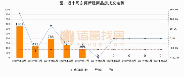 进入2024年第22周(05月27日-06月02日),东莞新建商品房成交0套,较上周持平
