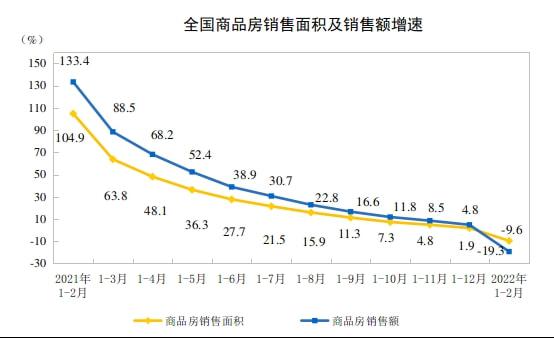 国家统计局数据显示,今年1-2月,全国商品房销售面积15703万平方米,同比下降9.6%,其中住宅销售面积下降13.8%;商品房销售额15459亿元,下降19.3%,其中住宅销售额下降22.1%。