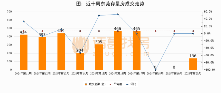 存量房方面,第20周东莞存量房成交136套,较上周持平。从近十周成交走势来看,周均成交套数为283套,本周低于平均水平51.9%。