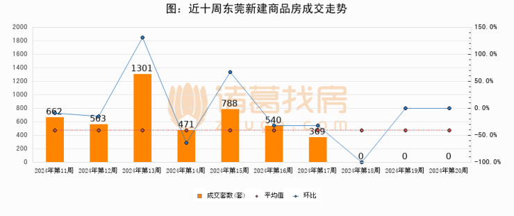 进入2024年第20周(05月13日-05月19日),东莞新建商品房成交0套,较上周持平