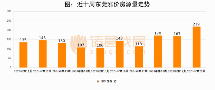 从调价房源来看,第20周东莞涨价房源219套,较上周上涨31.1%。与此同时,20周涨价房源占比提升0.13个百分点,业主信心持续恢复。