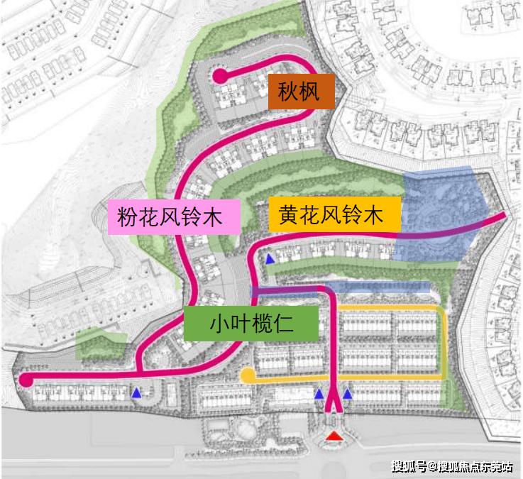 小区公共空间游园以观花乔木作为主题,如粉花风铃木、黄花风铃木、宫粉紫荆、 锦叶榄仁等,打造色彩缤纷的植物景观。边坡采用片植常绿及开花乔灌木,让人沐浴在移步易景,芳菲烂漫的园林意境中。