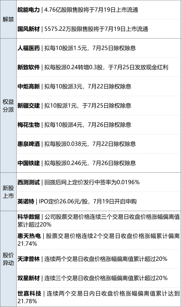 按7月15日收盘价计算,解禁市值居前三位的是:中微公司(328.49亿元)、澜起科技(321.12亿元)、杭可科技(204.1亿元)。从个股的解禁量看,解禁股数居前三位的是:中国外运(39.04亿股)、上海临港(8.99亿股)、宏和科技(7.42亿股)。