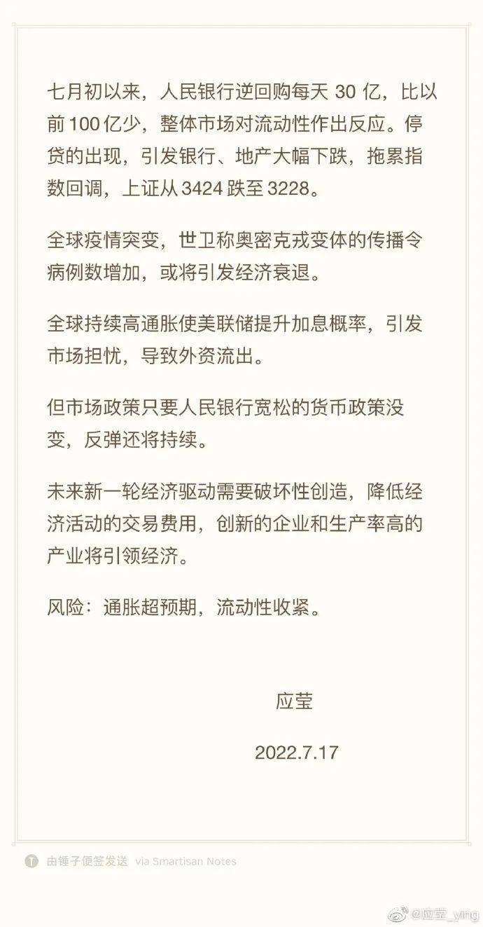 NO.77月17日, 徐翔之妻应莹又在个人公众号上发布每周市场点评:全球疫情突变,世卫称奥密克戎变体的传播令病例数增加,或将引发经济衰退。 全球持续高通胀使美联储提升加息概率,引发市场担忧。但市场政策只要人民银行宽松的货币政策没变,反弹还将持续。未来新一轮经济驱动需要破坏性创造,降低经济活动的交易费用,创新的企业和生产率高的产业将引领经济。风险:通胀超预期,流动性收紧。