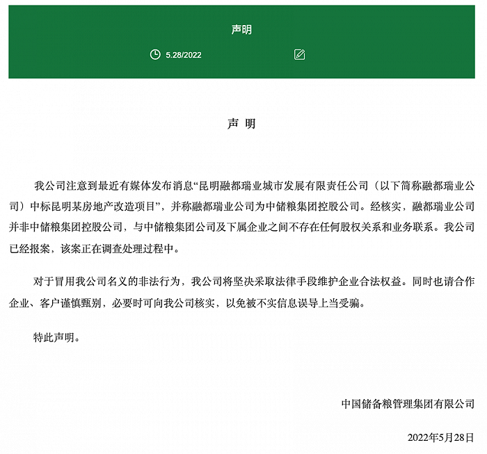 中储粮声明:中标昆明某房地产改造项目的融都瑞业公司非集团控股公司