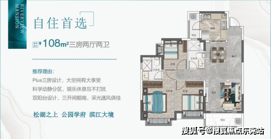 建面约108㎡三房两厅两卫户型,不仅配置有景观阳台、家政阳台,还做到三开间朝南,客厅、主卧、次卧均朝南,无论是家人居住,还是日常起居,都能拥有健康生活。