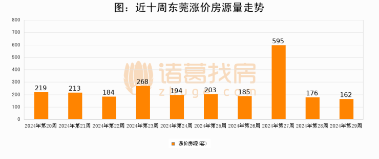 从调价房源来看,第29周东莞涨价房源162套,较上周下降8%。与此同时,29周涨价房源占比回落1个百分点,业主信心小幅波动,购房者可则需入市。