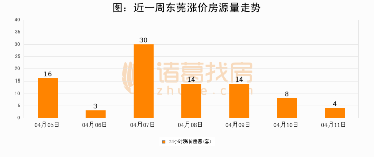根据诸葛找房数据显示,东莞24小时涨价房源量为4套,较04月10日减少4套,环比下降50%。与此同时,涨价房源占比小幅回落,对于购房者来说是一个入市窗口期,购房者可抓住时机入市。