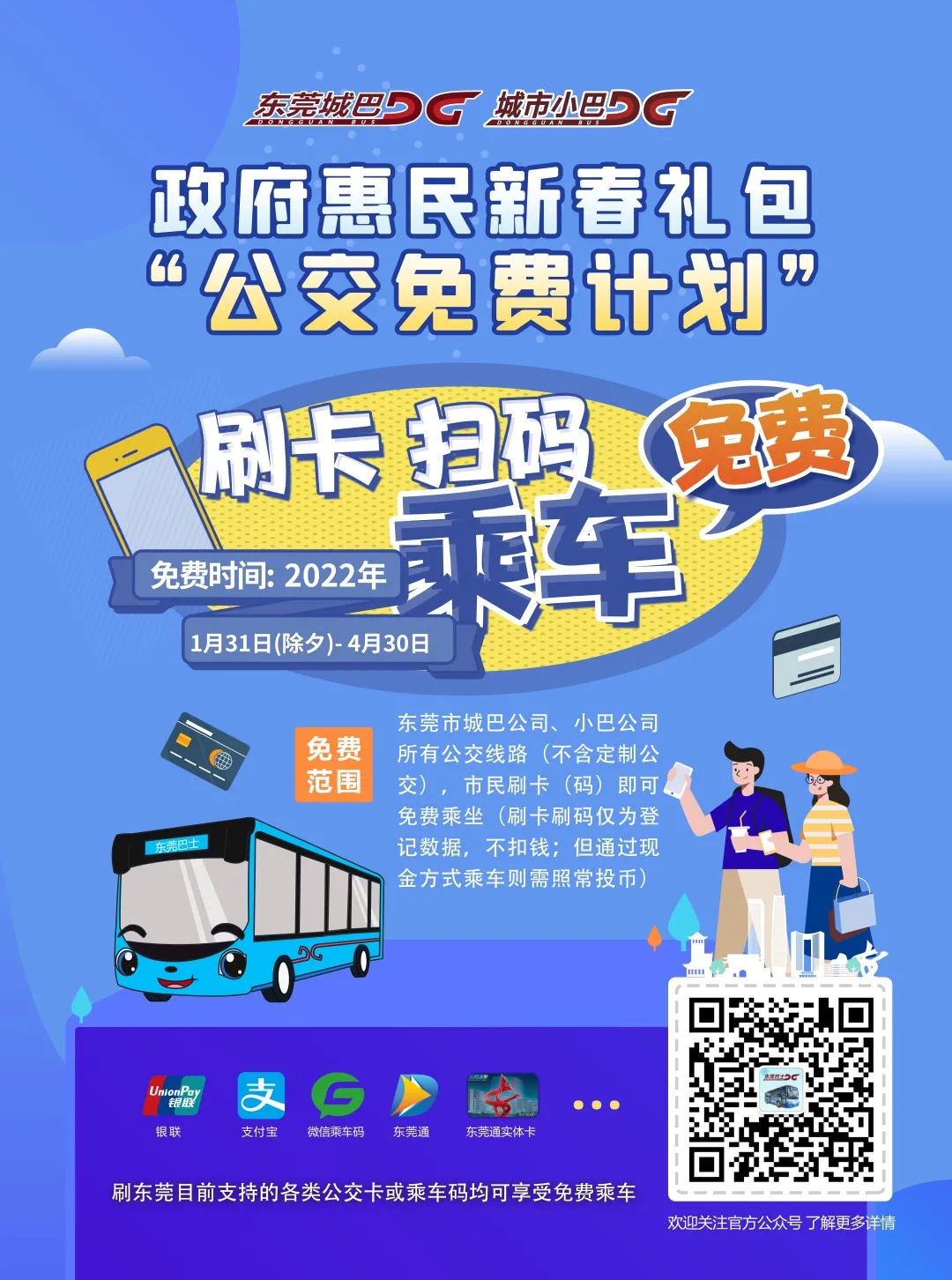 从除夕(1月31日)起,市民乘坐东莞巴士下属城巴公司、小巴公司所有的公交线路(不含定制公交),刷卡(码)即可免费乘坐。活动时间持续至4月30日,活动期间不限乘车次数。