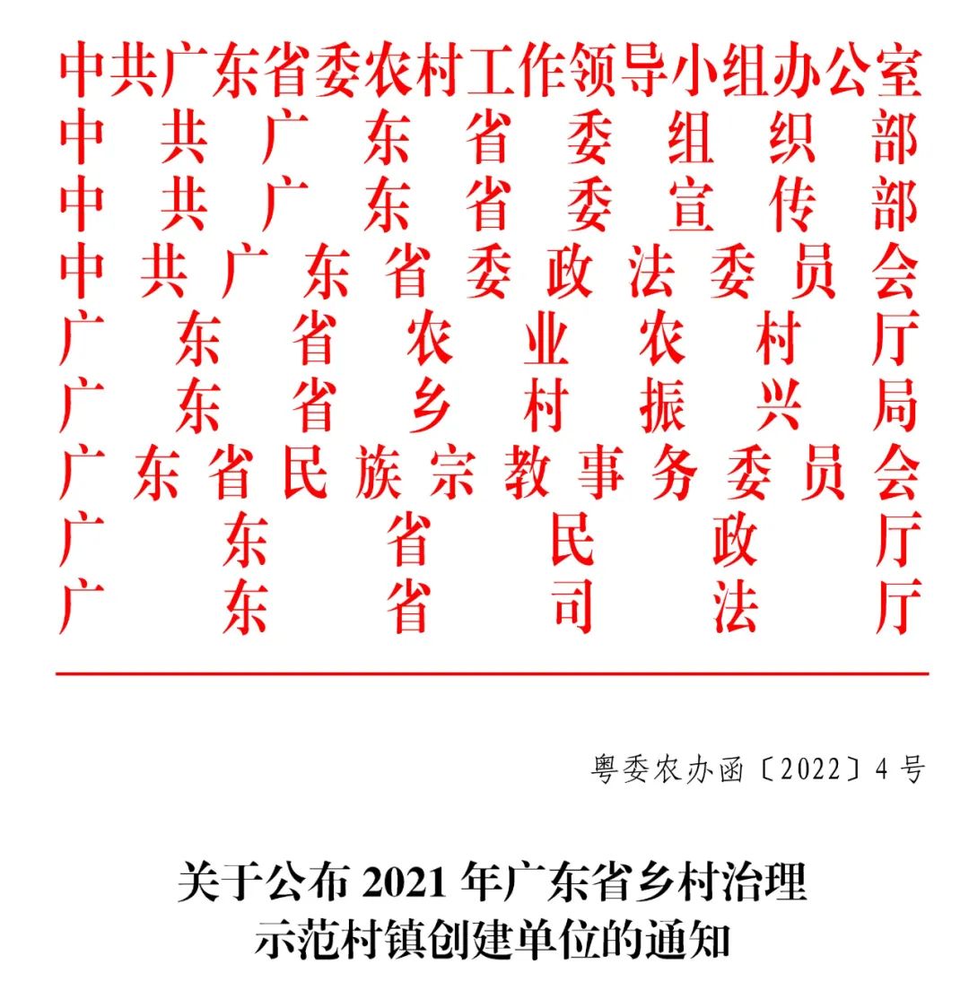 近日,省委农办、省组织部等多部门联合发文《关于公布2021年广东省乡村治理示范村镇创建单位的通知》,中堂镇凤冲村、江南社区顺利通过验收评估,被评为“2021年广东省乡村治理示范村”。