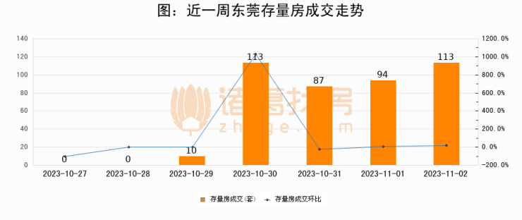 从存量房来看,2023年11月02日东莞存量房单日成交113套,比昨日增加19套,环比上涨20.2%。从近一周存量房成交来看,东莞存量房日均成交套数为59套,11月02日单日成交113套,高于近一周平均水平91.5%。