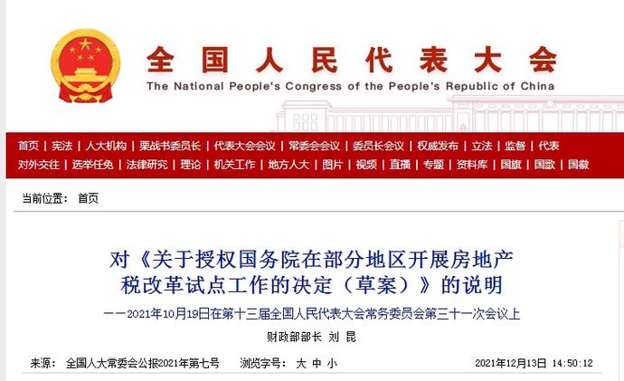 据中国人大网2021年12月13日消息,2021年10月19日,财政部部长刘昆在第十三届全国人民代表大会常务委员会第三十一次会议上,对《关于授权国务院在部分地区开展房地产税改革试点工作的决定(草案)》进行说明。