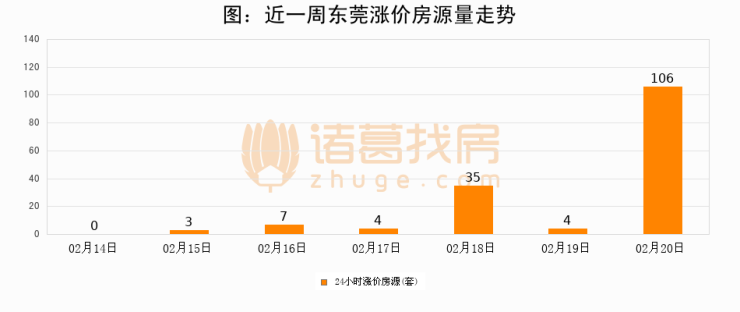 根据诸葛找房数据显示,东莞24小时涨价房源量为106套,较02月19日增加102套,环比上涨2550%。与此同时,涨价房源占比小幅扩大,业主信心有所提升。
