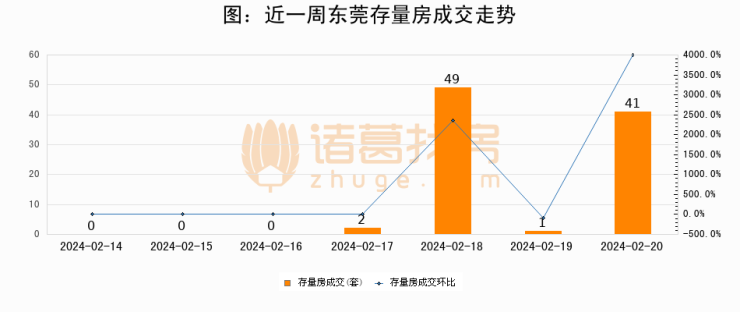 从存量房来看,2024年02月20日东莞存量房单日成交41套,比昨日增加40套,环比上涨4000%。从近一周存量房成交来看,东莞存量房日均成交套数为13套,02月20日单日成交41套,高于近一周平均水平215.4%。