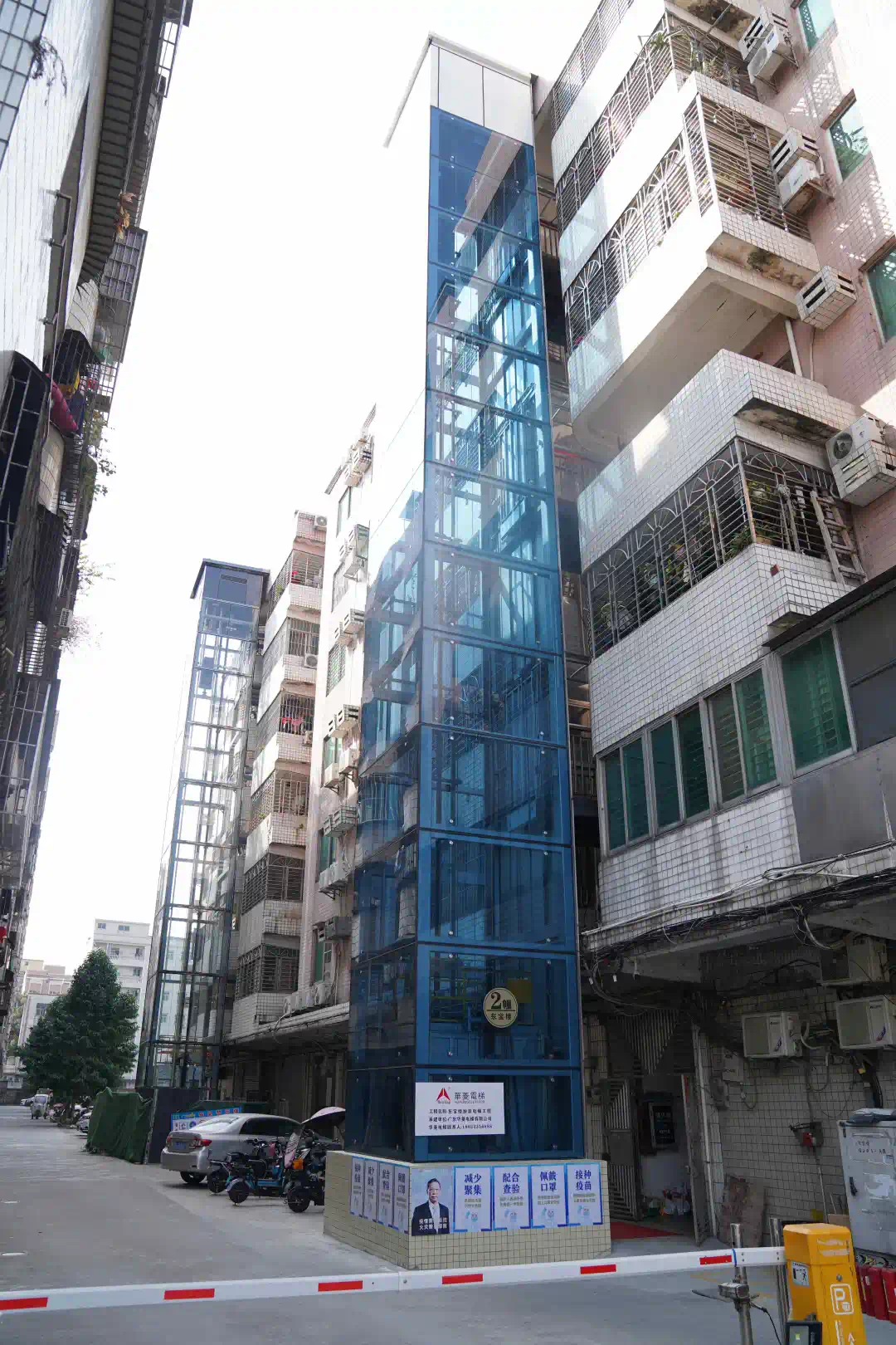 经过耐心沟通,整栋楼的业主们全部同意加装电梯,并确定采用观光透明电梯,保证采光。