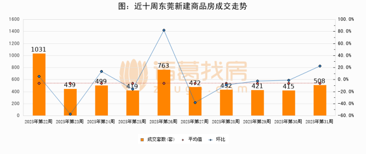 进入2025年第31周(07月28日-08月03日),东莞新建商品房成交508套,较上周增加93套,环比上涨22.4%