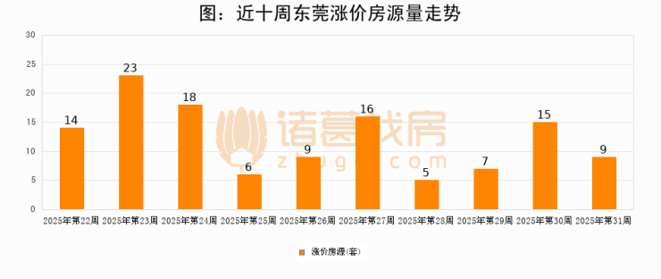 从调价房源来看,第31周东莞涨价房源9套,较上周下降40%。与此同时,31周涨价房源占比回落6.08个百分点,业主信心小幅波动,购房者可则需入市。