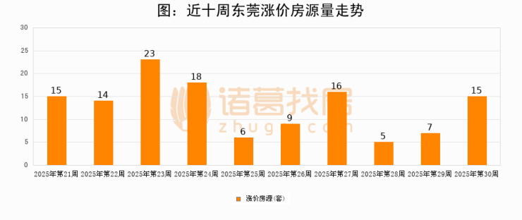从调价房源来看,第30周东莞涨价房源15套,较上周上涨114.3%。与此同时,30周涨价房源占比提升7.02个百分点,业主信心持续恢复。