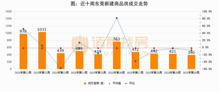 进入2025年第30周(07月21日-07月27日),东莞新建商品房成交390套,较上周减少31套,环比下降7.4%