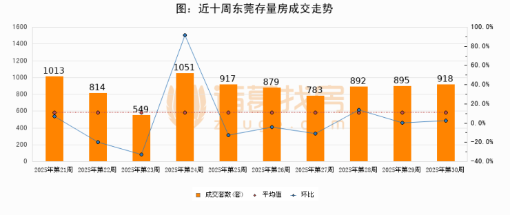 存量房方面,第30周东莞存量房成交918套,较上周增加23套,环比上涨2.6%。从近十周成交走势来看,周均成交套数为871套,本周高于平均水平5.4%。