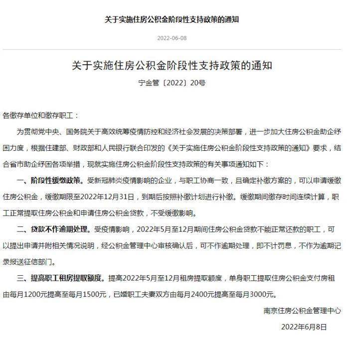 中新财经6月9日电江苏南京住房公积金管理中心8日发布《关于实施住房公积金阶段性支持政策的通知》,提出提高2022年5月至12月租房提取额度,单身职工提取住房公积金支付房租由每月1200元提高至每月1500元,…