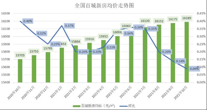 数据显示,2021年10月,全国100个城市新建住宅平均价格为16189元/平方米,环比上涨0.09%。