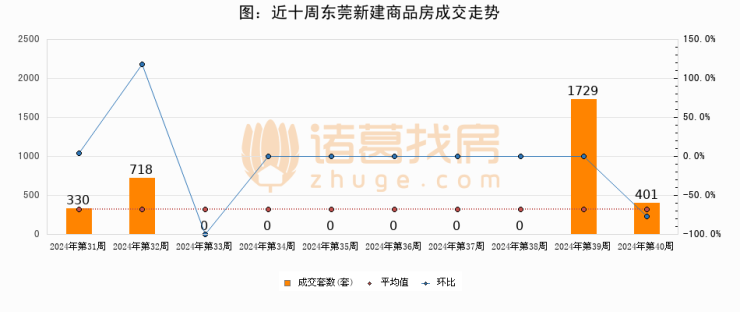 进入2024年第40周(09月30日-10月06日),东莞新建商品房成交401套,较上周减少1328套,环比下降76.8%