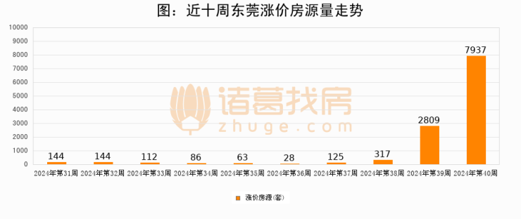 从调价房源来看,第40周东莞涨价房源7937套,较上周上涨182.6%。与此同时,40周涨价房源占比提升3.22个百分点,业主信心持续恢复。